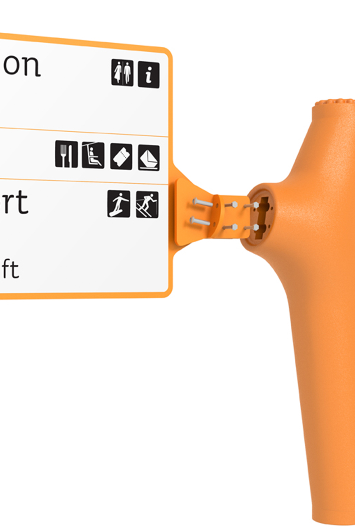 The resultant signage system is made up of two modular sand-cast aluminum components—short and tall—designed to slide over standard street poles and lock together, allowing for various configurations. The sand-cast aluminum includes an inbuilt locking mechanism, enabling on-site information and wayfinding changes to address the seasonal requirements.